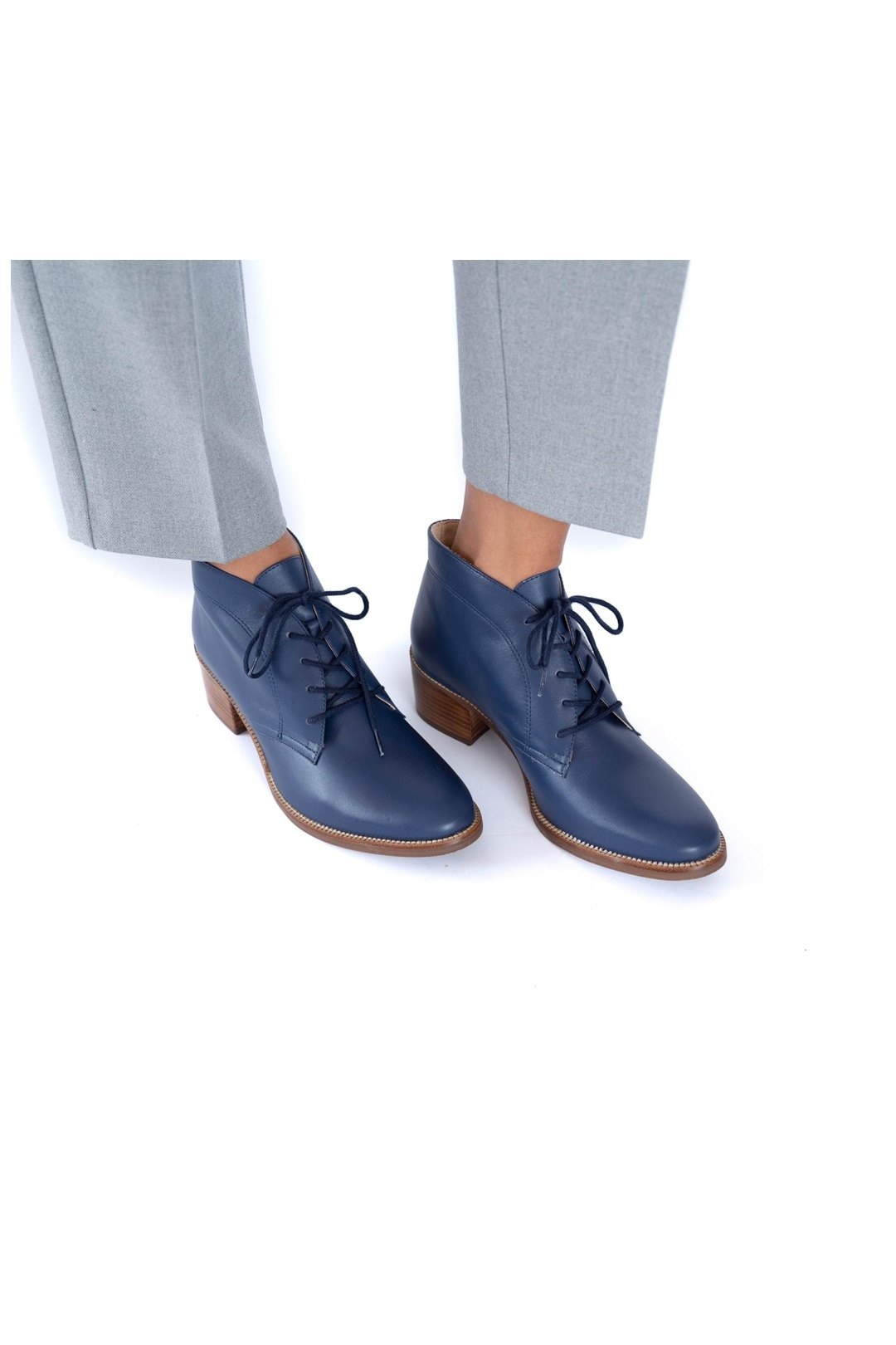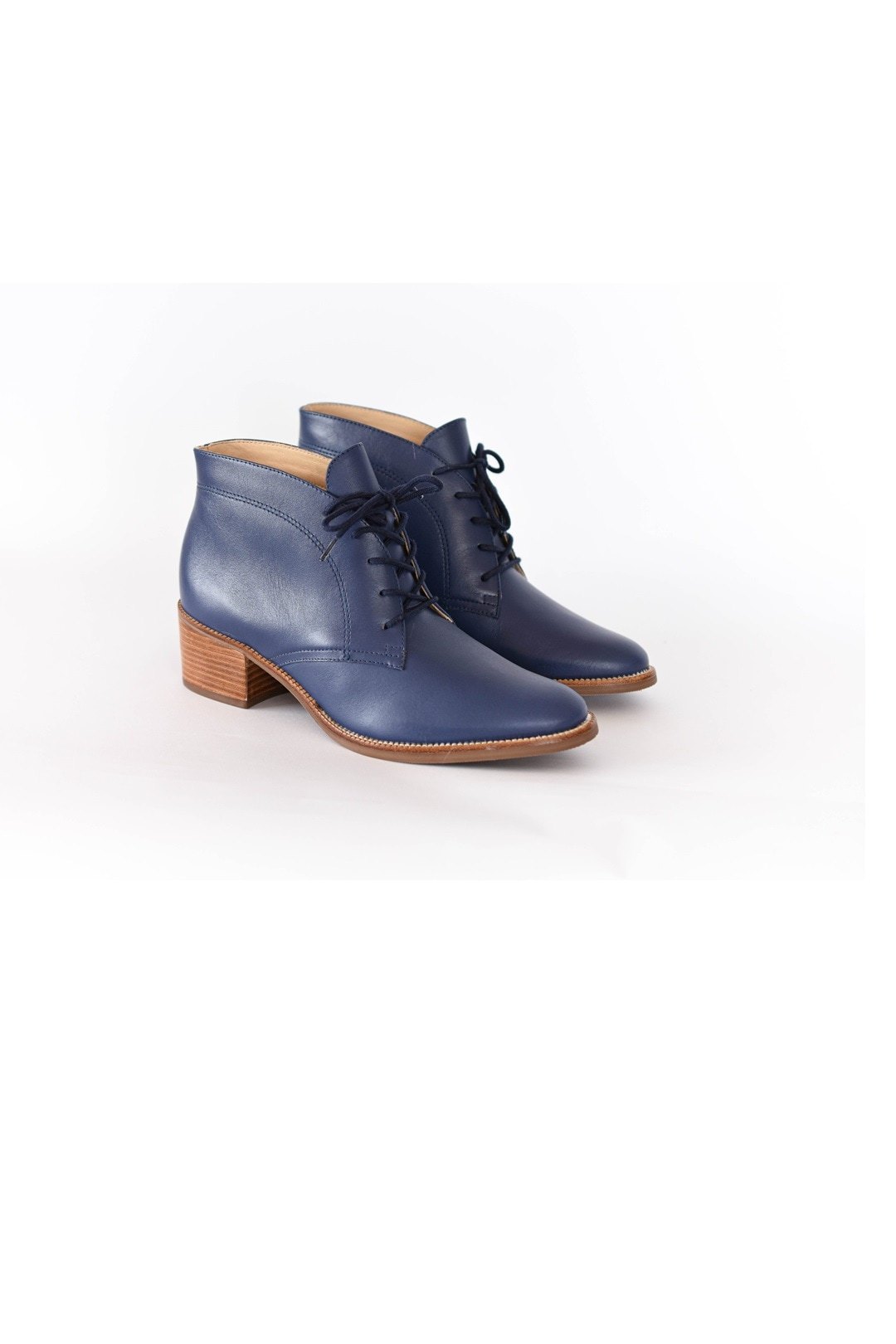 Botines de cuero azul profundo. Diseño clásico y cordones frontales. Un tacón bloque de madera clara de aproximadamente 6 cm, eleva tu presencia con comodidad y distinción.