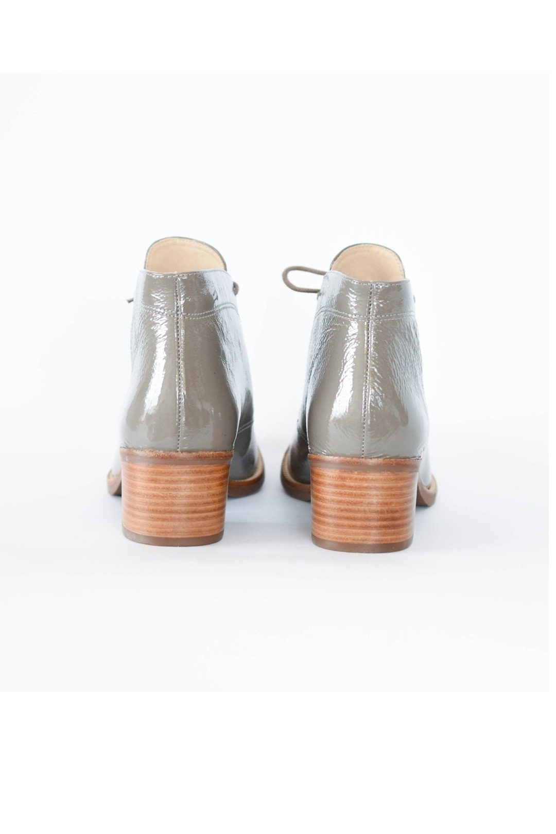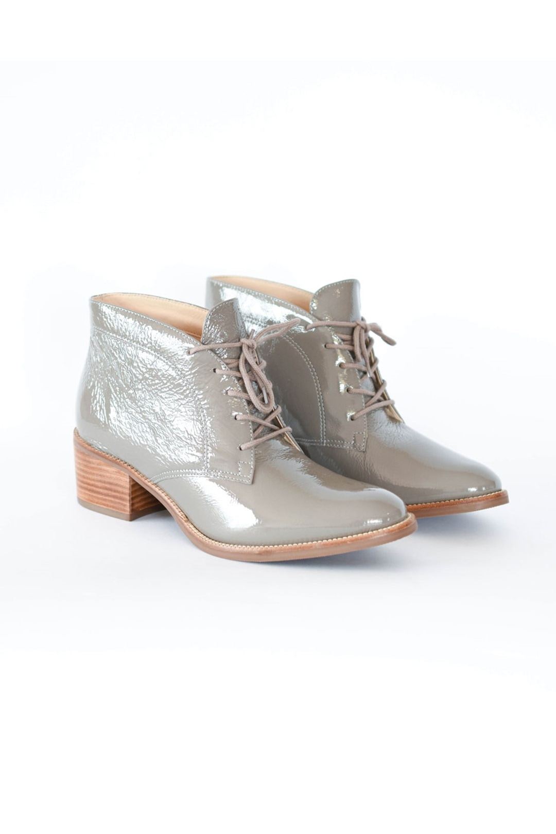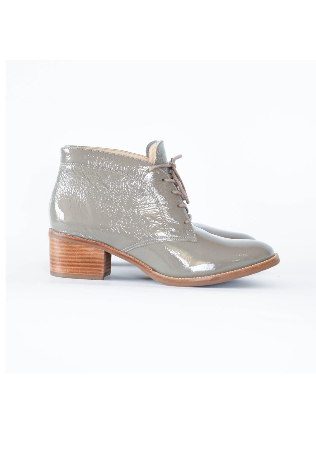 Eleva tu estilo uruguayo con estos botines grises en cuero charol brillante. Su diseño clásico con cordones frontales y un tacón bloque de madera clara aproximadamente 6 cm, ofrece una fusión de elegancia atemporal y un toque moderno y sofisticado para destacar con luz propia en cada rincón de Uruguay.