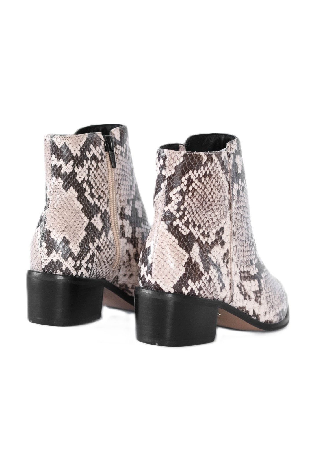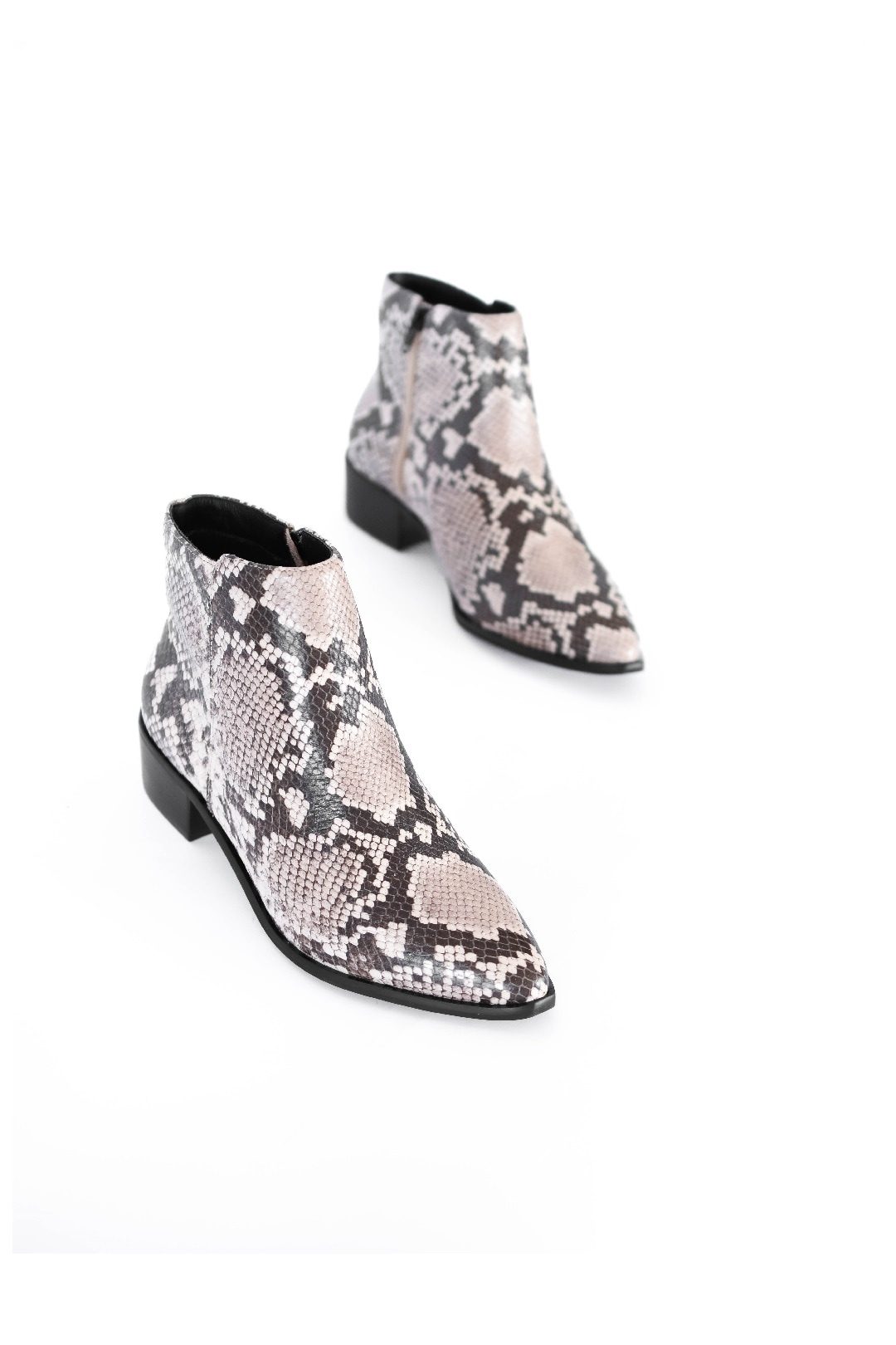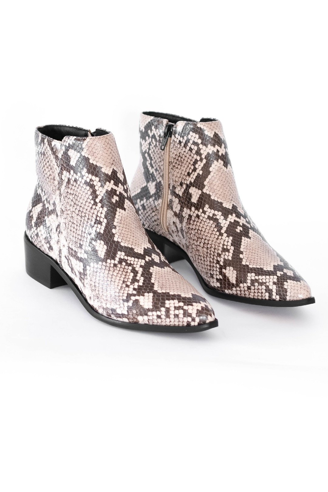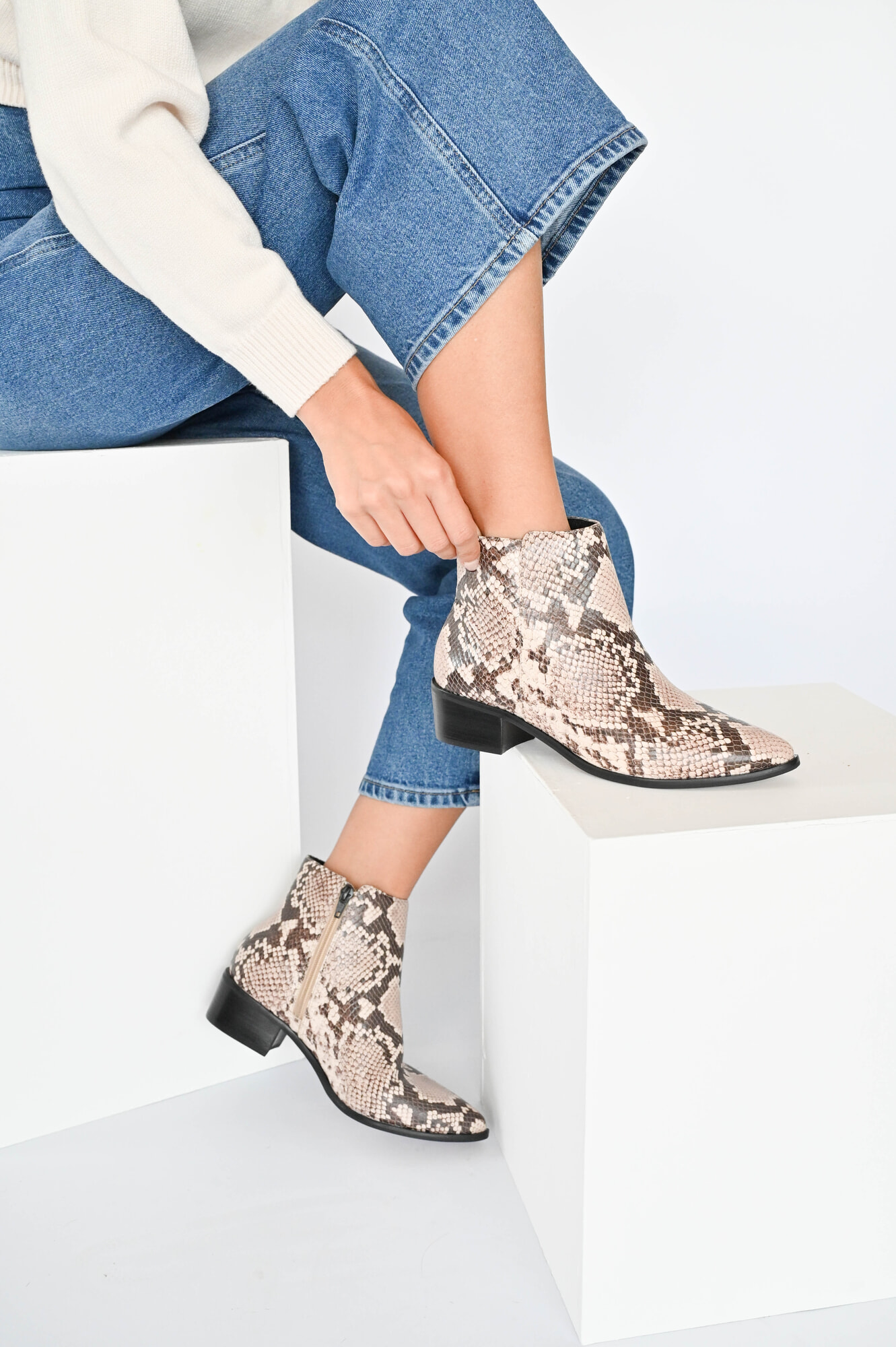 Envuelve tus pies en la distinción de un estampado de escamas moderno en tonos neutros. Estos botines de diseño elegante y caña baja, con un cómodo tacón bloque, elevan tu presencia con un toque de sofisticación audaz para destacar con personalidad.