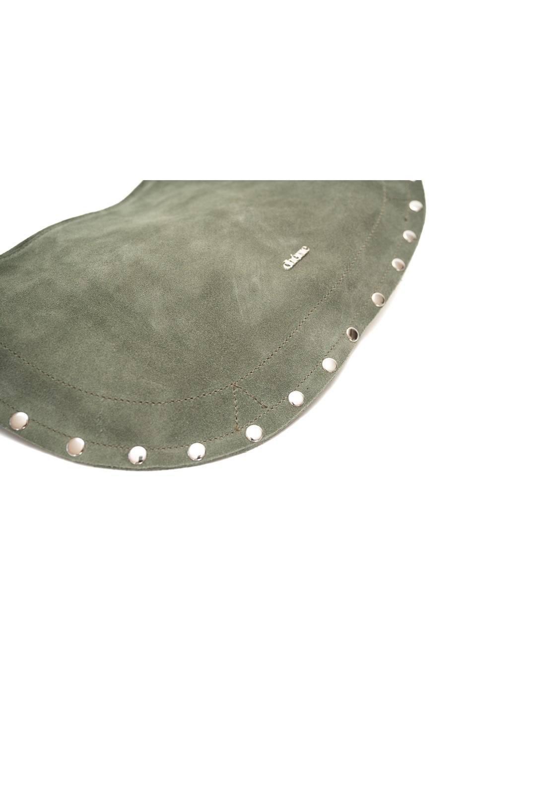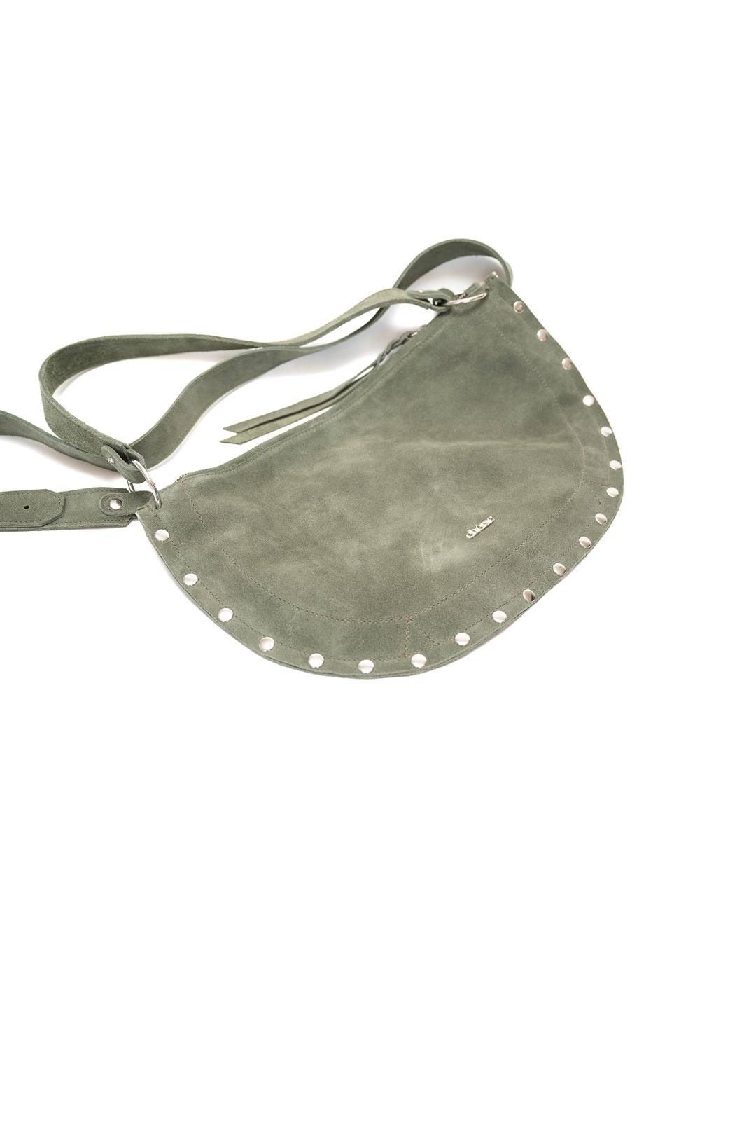 Cartera 100% gamuza color oliva, de tamaño mediano y forma curva. Posee una correa ajustable y detalles de pequeñas tachuelas metálicas en el borde inferior. Un logo discreto se encuentra en el centro. Presenta un estilo casual y una textura suave.