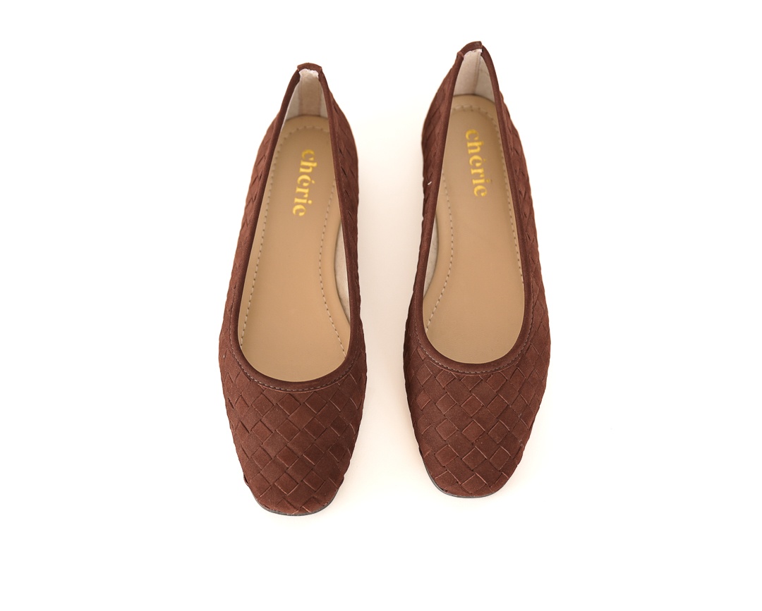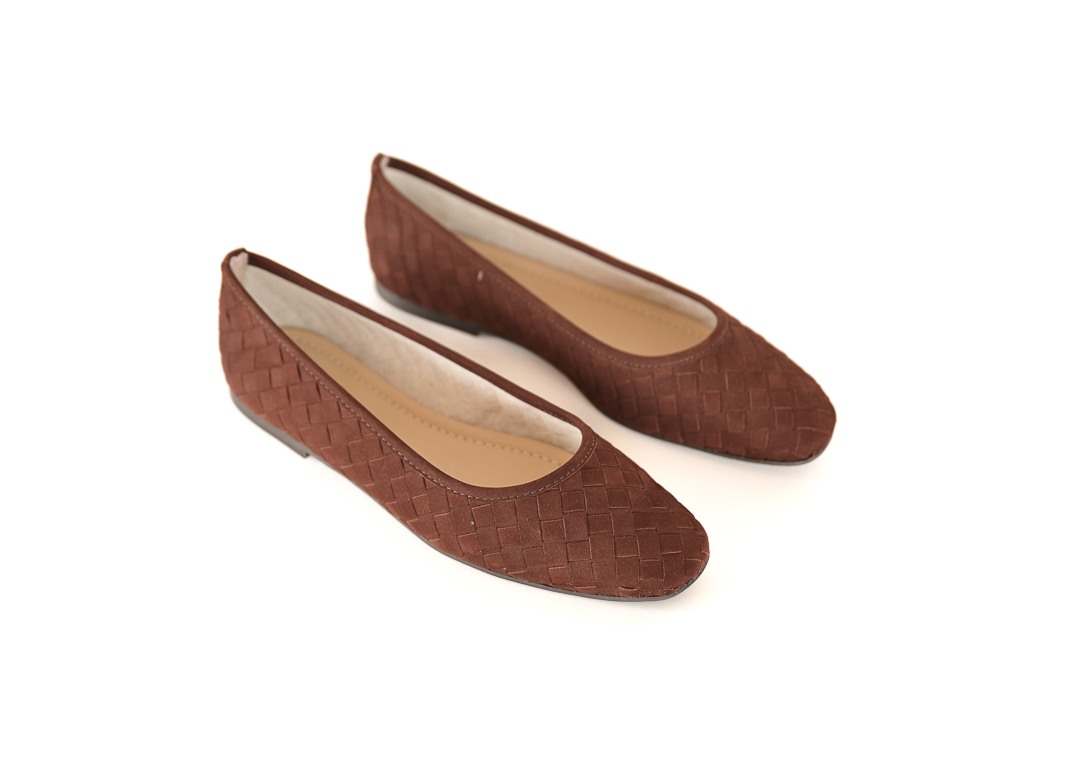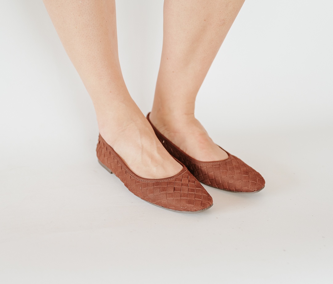 Bailarina de cuero gamuzado con efecto tramado entrelazado. Fabricadas artesanalmente con cuero 100% genuino, estas balerinas trenzadas no solo deslumbran por su diseño, sino también por su comodidad. El proceso de curtido especial del cuero le otorga un tacto suave y flexible desde el primer momento, adaptándose a la forma de tu pie para un ajuste perfecto. Su forro de piel garantiza una excelente absorción del sudor, manteniendo tus pies frescos, secos y libres de olores incluso en los días más largos.