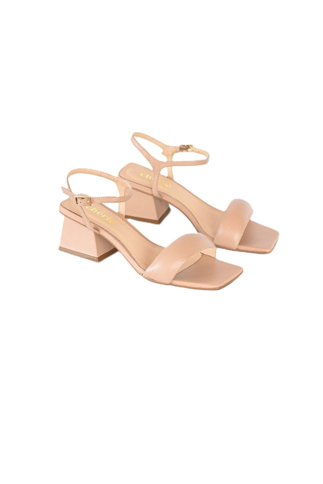 Sandalias en cuero Nude. Su diseño minimalista presenta una tira ancha, pulsera delicada al tobillo y un tacón bloque (aproximadamente 5 cm), ofreciendo un equilibrio perfecto entre elegancia discreta y comodidad para complementar tus looks en Uruguay.