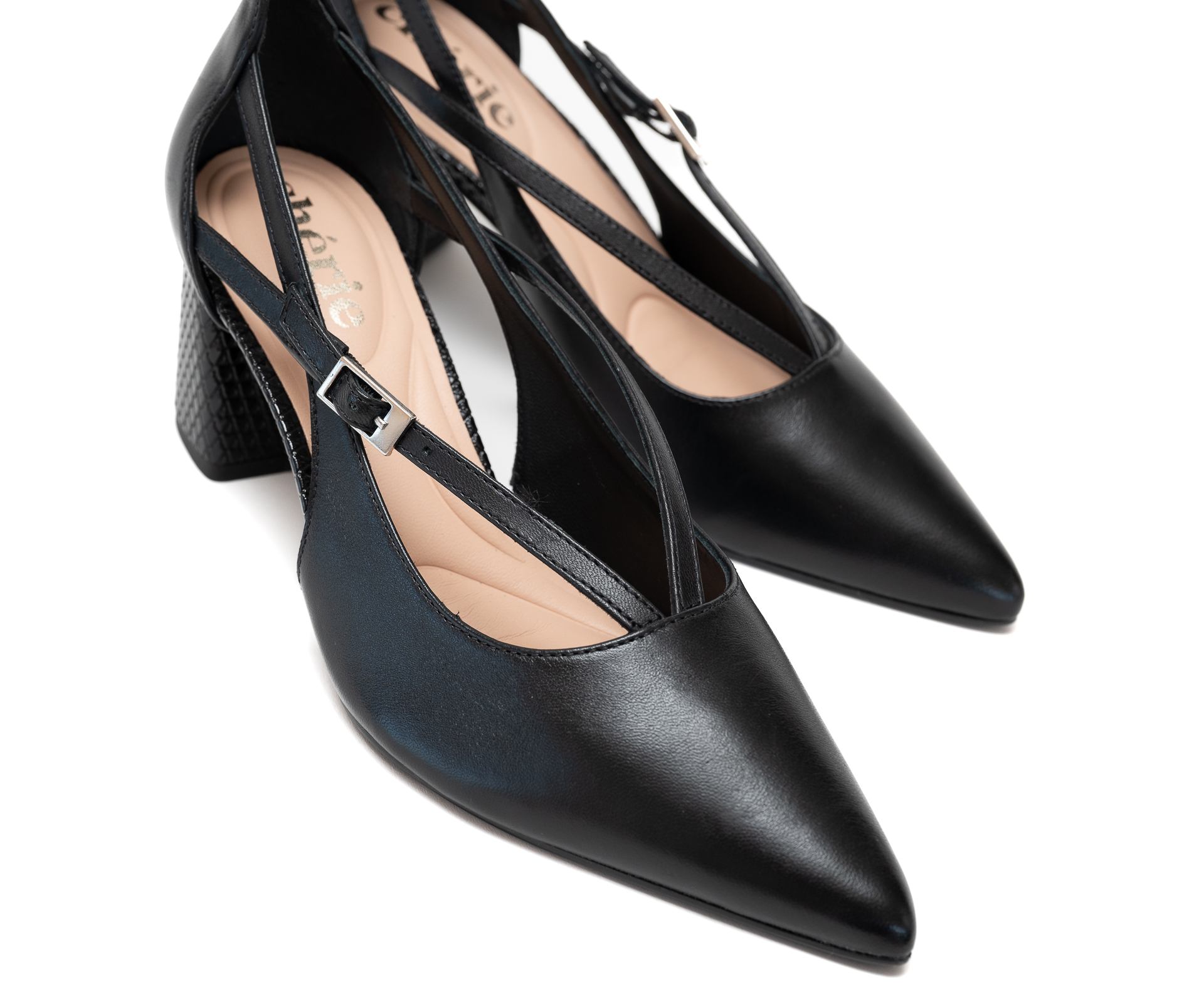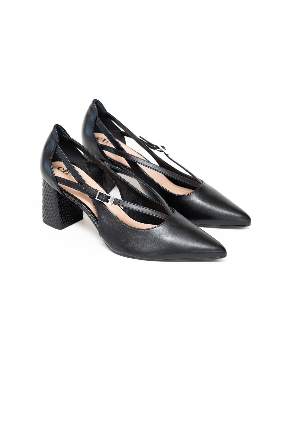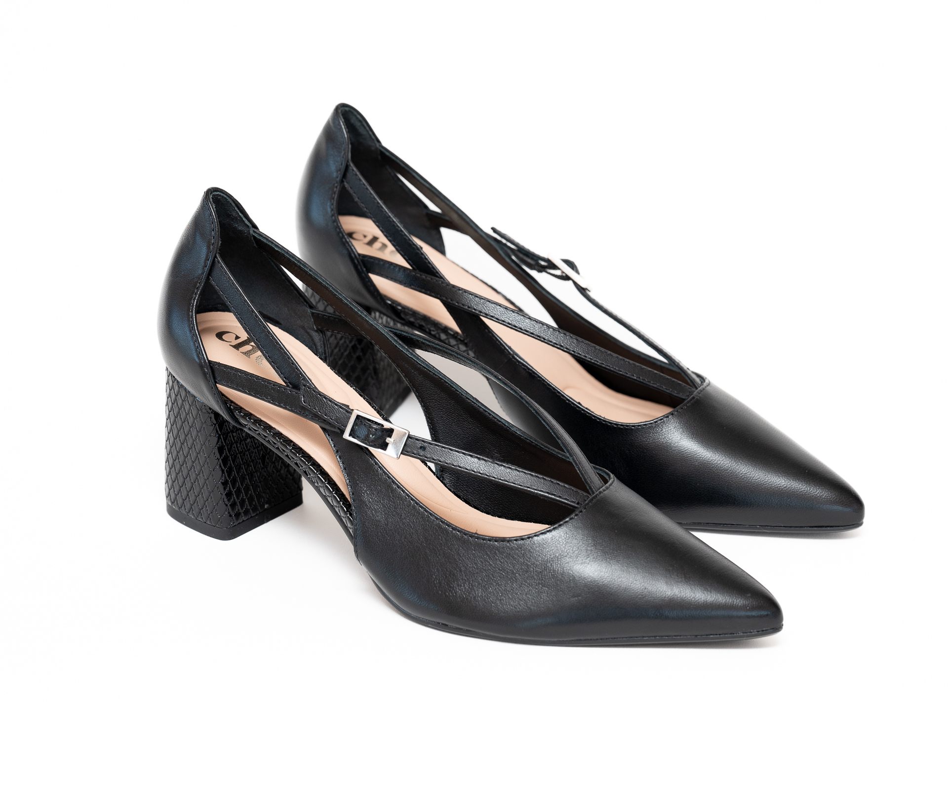 Estos elegantes zapatos de tacón negros con punta fina presentan un diseño único con múltiples tiras delgadas que se entrecruzan sobre el empeine, añadiendo un toque moderno. Los zapatos tienen un talón cerrado y un tacón de bloque con un sutil patrón texturizado. Una delicada hebilla de color plateado abrocha una de las tiras en el lateral de cada zapato, proporcionando ajuste y un sutil acento metálico.