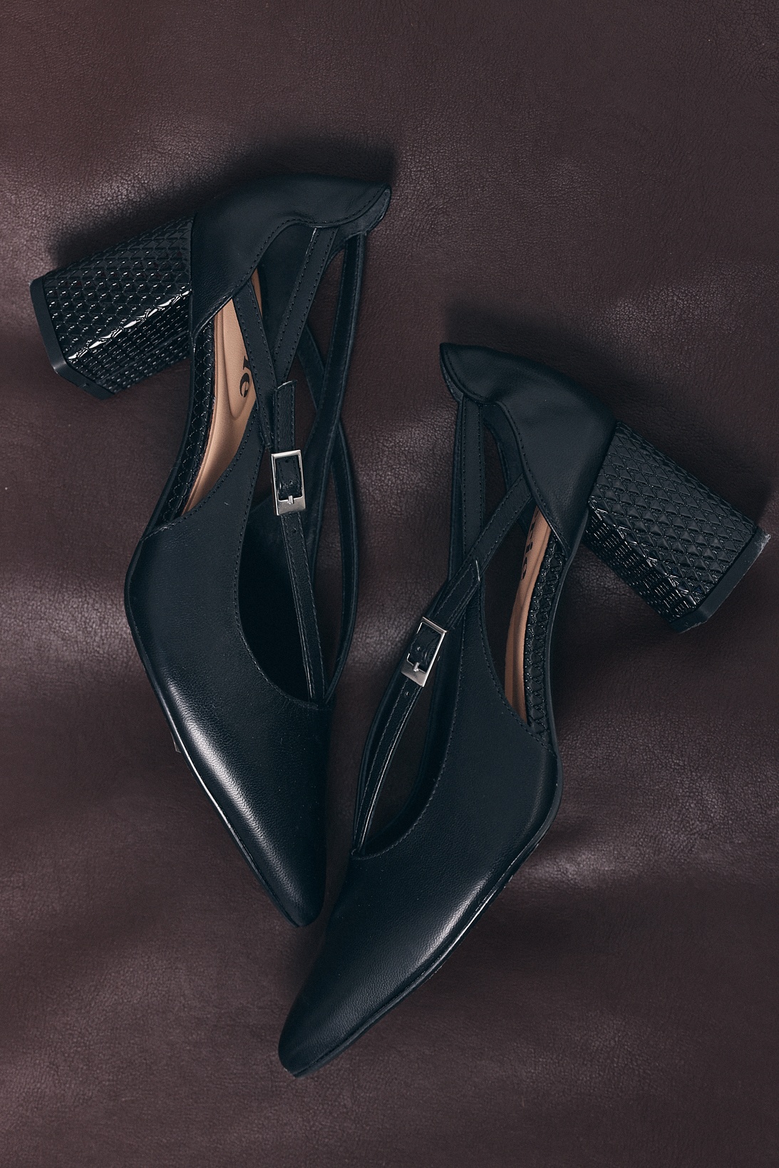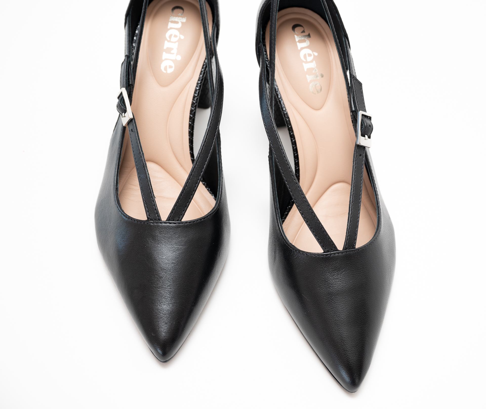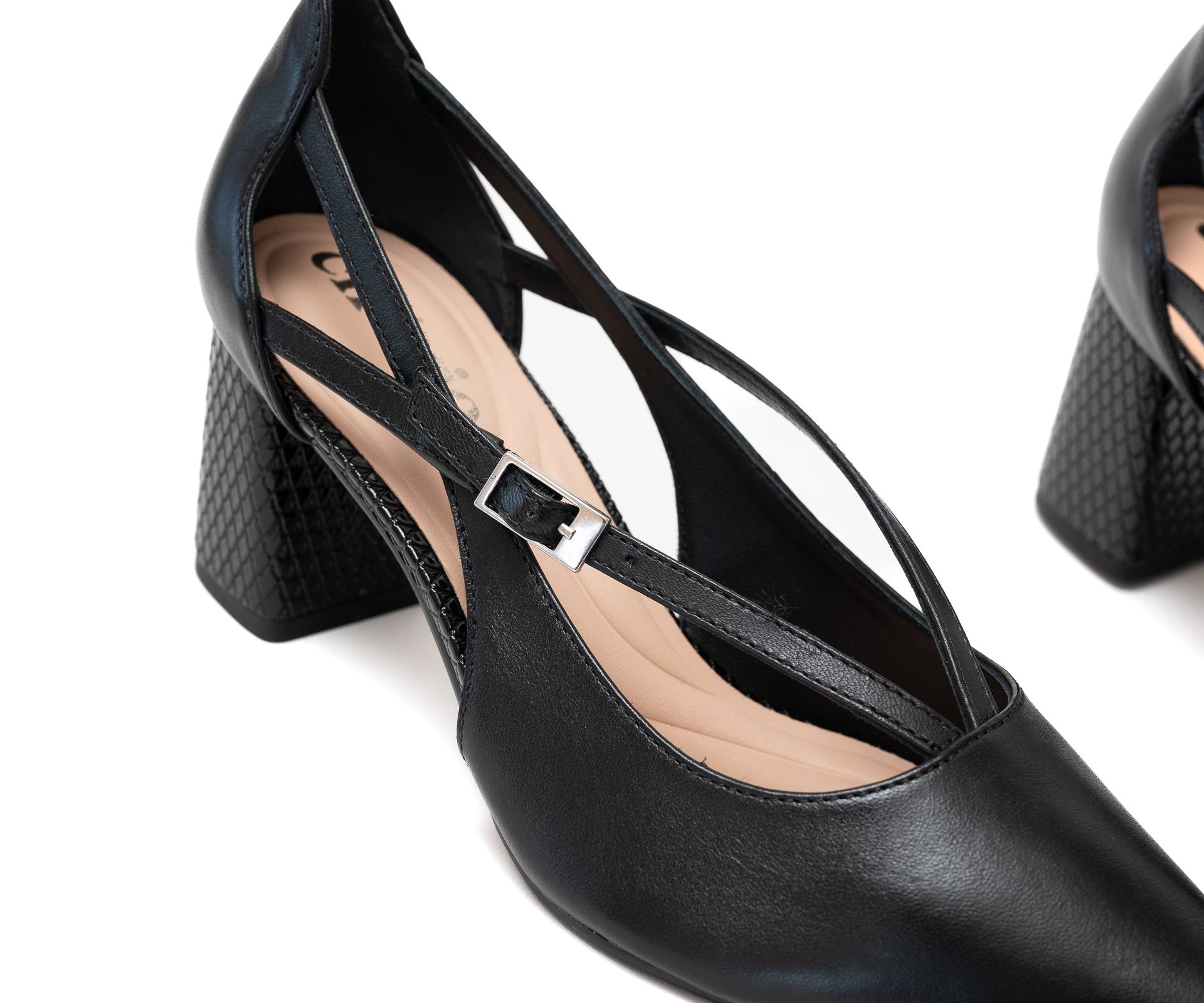 Estos elegantes zapatos de tacón negros con punta fina presentan un diseño único con múltiples tiras delgadas que se entrecruzan sobre el empeine, añadiendo un toque moderno. Los zapatos tienen un talón cerrado y un tacón de bloque con un sutil patrón texturizado. Una delicada hebilla de color plateado abrocha una de las tiras en el lateral de cada zapato, proporcionando ajuste y un sutil acento metálico.