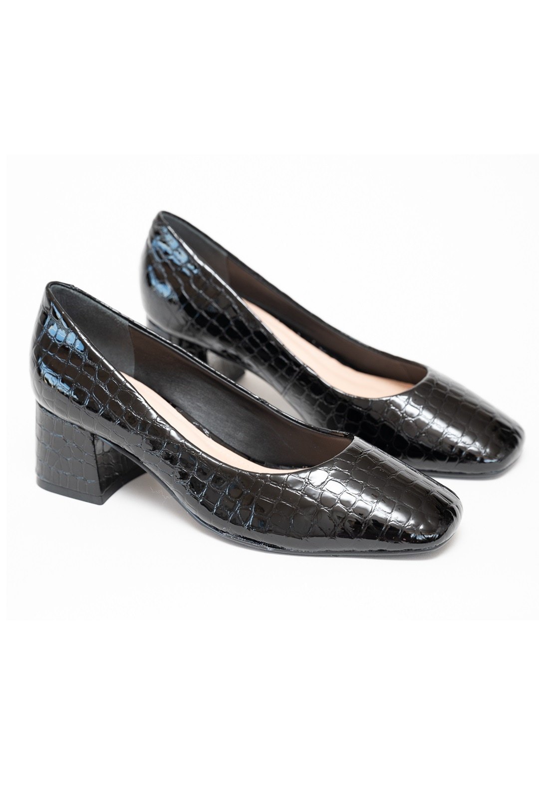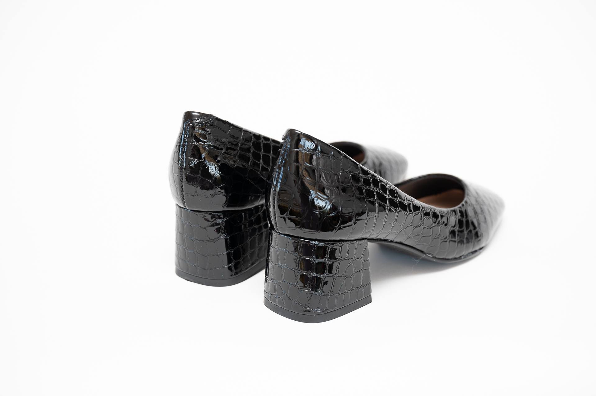Tacón: Cuadrado y grueso, 5 cm aprox. cubierto con el mismo material negro grabado , proporciona estabilidad y comodidad.